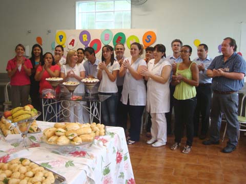 Membros da diretoria compareceram a festa para homenagear os aniversariantes. A homenagem realizada pelo Grupo de Trabalho e Humanização - GTH, é mensal, sempre na terceira sexta-feira do mês. O convite para a festividade vem junto com o holerite dos aniversariantes do mês. Os aniversariantes também concorrem a uma premiação de R$100,00 que este mês foi entregue a funcionária Maridalva Semolin do setor de custos do hospital.