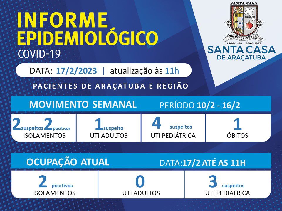 Óbito Homem com 68 anos, de Araçatuba, internado em 16 de janeiro por diagnóstico positivo para covid, foi a óbito em 16/2.Tinha comorbidades e estava com os ciclos de vacinação completos.