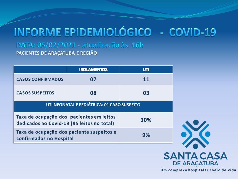 Mulher com 89 anos, de Araçatuba, internada em 29/1 por diagnóstico positivo de covid, faleceu ontem (4/2) às 23h53.