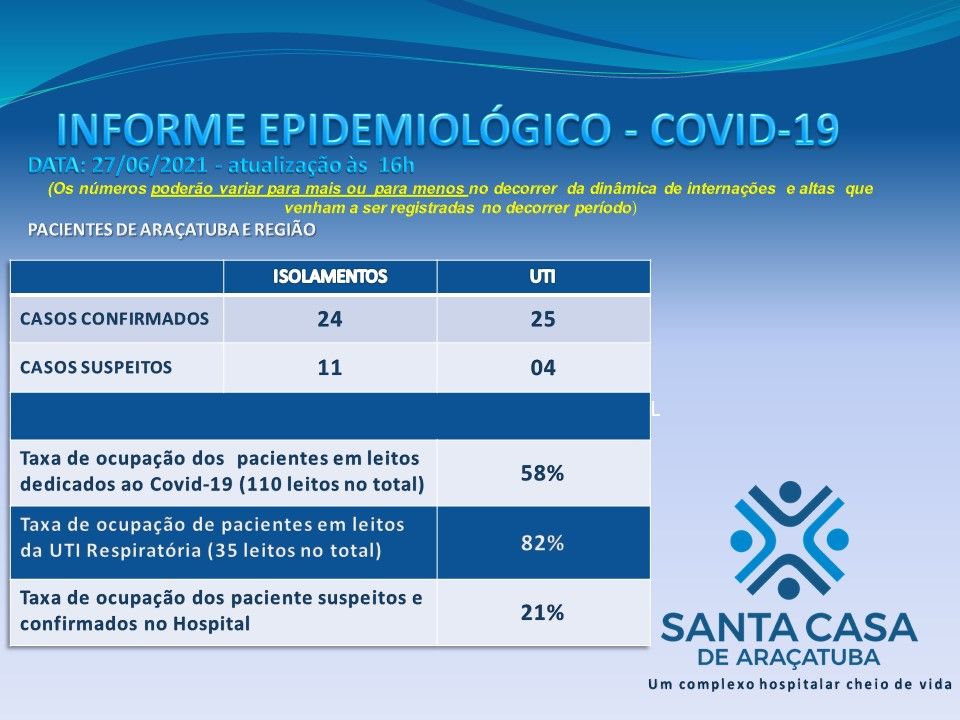 Mulher com 83 anos, de Araçatuba, internada em 24/6 por diagnóstico positivo para covid, faleceu hoje ( 27/6) às 14h34.
