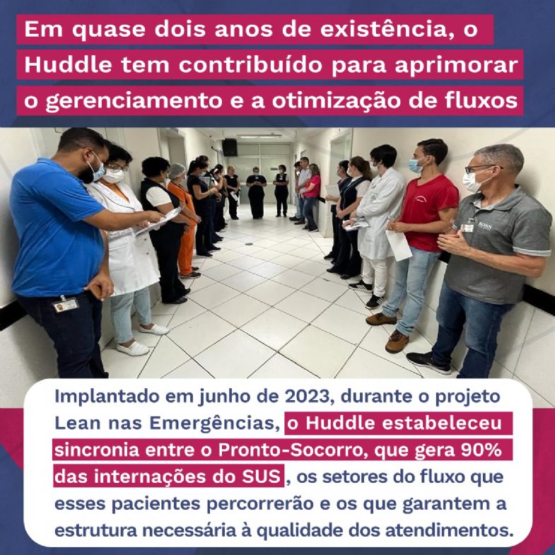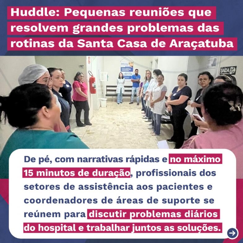 Essas reuniões são denominadas de Huddles, prática que possibilita o gerenciamento de problemas pontuais no hospital. O huddle foi implantado na Santa Casa de Araçatuba em junho de 2023 como uma das ferramentas do Lean nas Emergências. Foi tão importante aos avanços propostos pelo programa do Ministério da Saúde, criado para destravar prontos-socorros do SUS, que foi incorporado às rotinas gerenciais do hospital.